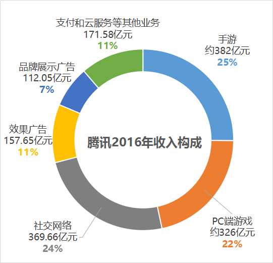 结合前三个季度的财报数据统计得出,2016年全年腾讯手游收入为382亿元,已经占据腾讯游戏业务的半壁江山,相当于贡献了腾讯约25%的收入。