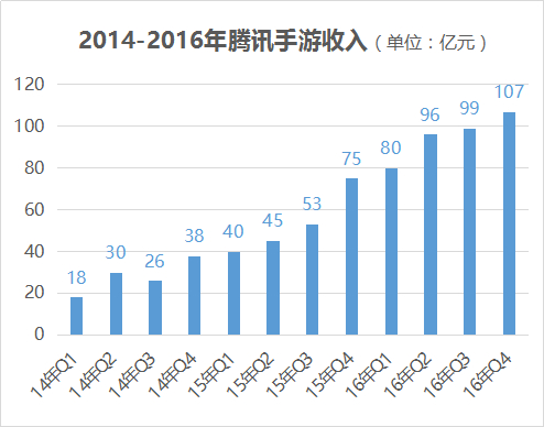 腾讯在手游业务上也在不断地刷新自己的记录。从过往的财报数据来看,自2014年开始,腾讯手游的营收就不断创下新高,从2014年一季度的18亿元,到2016年四季度的107亿元,已经翻了5倍。