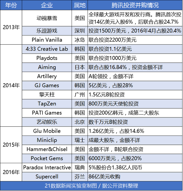 据21数据新闻实验室统计,2016年,腾讯一共买买买了等8家游戏企业。其中,最让人印象深刻的是年中作价86亿元完成对世界顶级手游开发公司芬兰Supercell的收购。