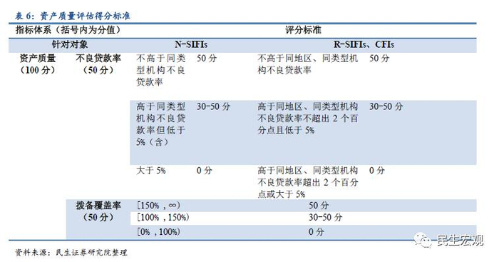 资产质量分为不良贷款率和拨备覆盖率两个指标,各占50分,具体打分标准见下表,大行采用绝对值衡量,股份制和区域性银行通过同类比较衡量。
