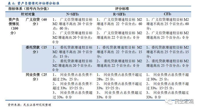 MPA评估体系对其监管的机构的评估分为3个方面,分别为广义信贷增速、委托贷款增速和同业负债增速,所对应的分数分别为60分、15分和25分。