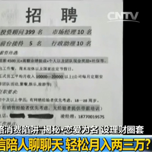 陪人微信聊聊天,就能月入轻松两三万,这样的工作去哪找?在一家名为杭州深言商贸公司的招聘广告上,从投资顾问到市场经理、行政助理,就号称有大量这样的岗位。求职者只需初中学历,填写一份简单的资料,便可上岗。待遇非常丰厚,月工资超过两万。