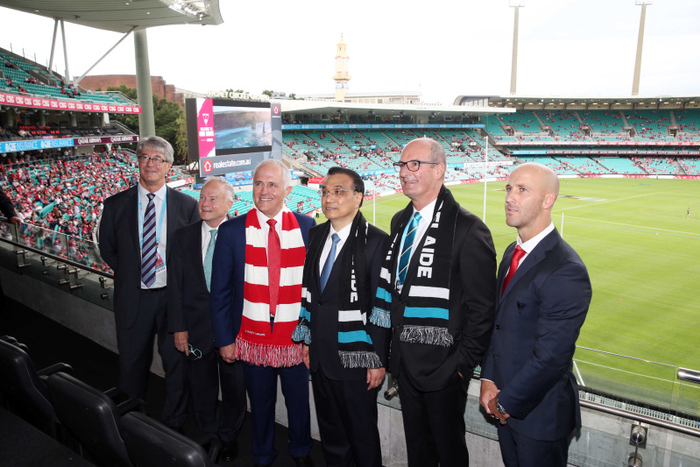 这场比赛的特殊之处在于现场的观众中既有中国总理李克强,也有澳大利亚总理特恩布尔,还有两国政府的高级官员。球场上上演的是竞技体育的输赢胜负、高下立判。球场下,两位总理和两国间则谈的是维护投资贸易自由化便利化,在国际竞争中求得“合作共赢”。