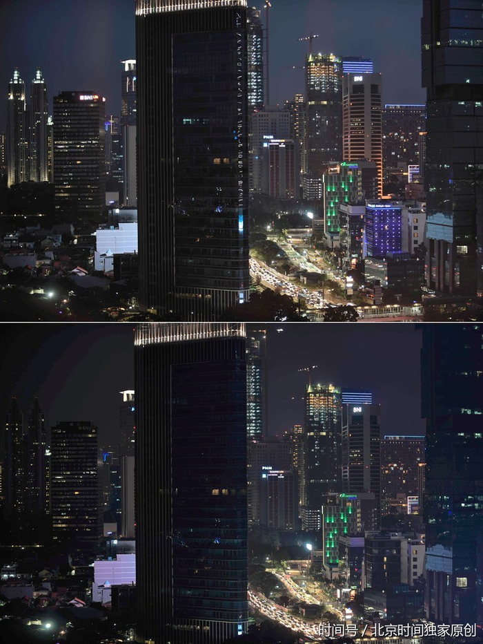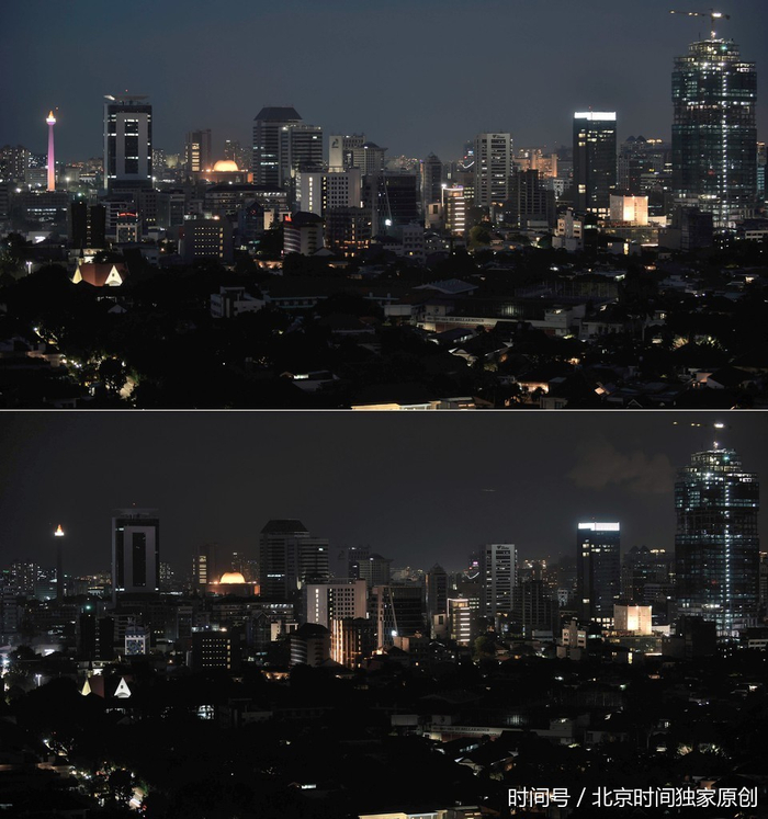 当地时间2017年3月25日,印尼雅加达参加“地球一小时”环保活动,多个地标建筑熄灯一小时。(图片来源:视觉中国)