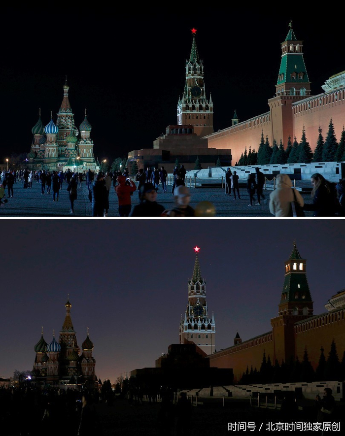 莫斯科克林姆林宫与红场熄灯响应“地球一小时”活动前后对比图。(图片来源:视觉中国)