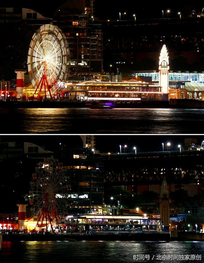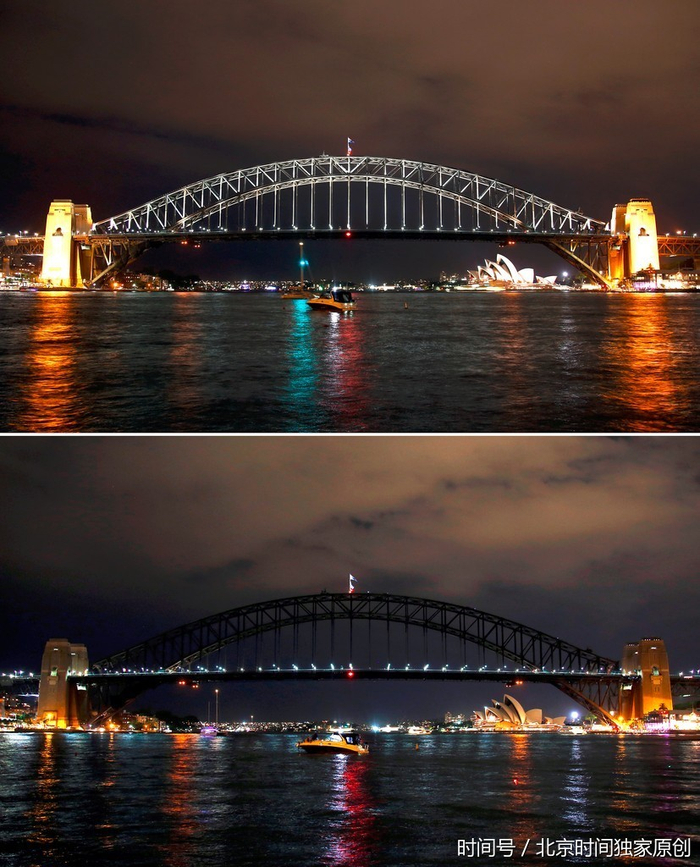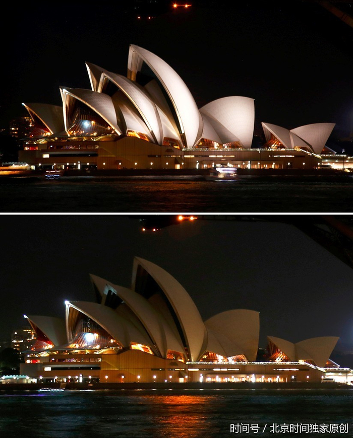 当地时间2017年3月25日,澳大利亚悉尼参加“地球一小时”环保活动,多个地标建筑熄灯一小时。(图片来源:视觉中国)