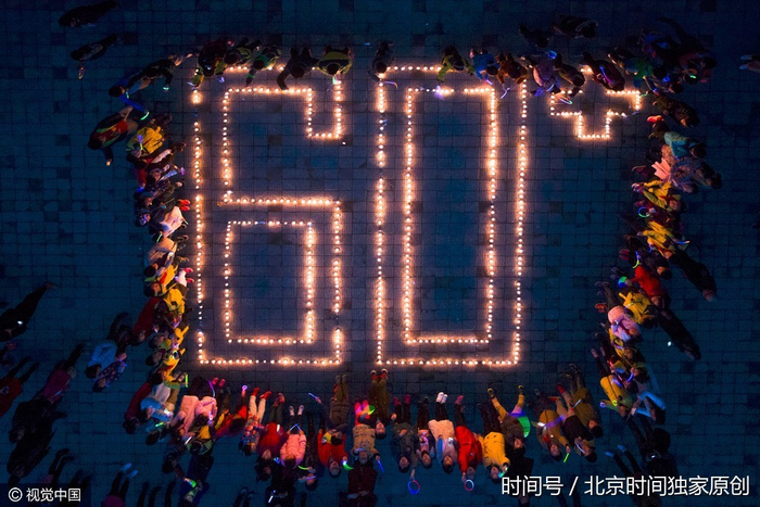 2017年3月25日傍晚,合肥市西园新村小学校园,一百多名5年级和6年级的同学点燃一个个蜡烛,在广场上摆出了一个“60+”的字样。(图片来源:视觉中国)
