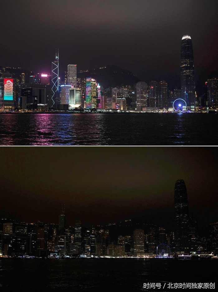 2017年3月25日,香港维多利亚港参加“地球一小时”熄灯前后对比。(图片来源:视觉中国)