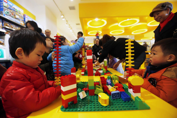 5、在专卖店里,儿童围绕着试玩桌拼搭模型。有数据统计,在乐高的故乡丹麦,每1200个孩子就拥有一家玩具店。而在中国,每30万个孩子才拥有一家玩具店。看好中国玩具市场的潜力,乐高历时6个月,从30多家企业中选择出了一家从事通讯终端产品销售的公司作为合作伙伴,开设的首家授权专卖店主打体验式零售。