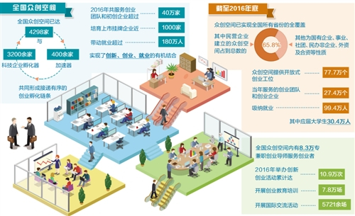 众创空间顺应互联网时代创新创业势头而生,成为搭载市场化机制、专业化服务和资本化途径,为创业者筹谋的新型创业服务平台。科技部火炬中心提供的数据显示,两年来,全国众创空间已达4298家,与3200余家科技企业孵化器和400余家加速器共同形成接递有序的创业孵化链条,2016年共服务创业团队和初创企业超过40万家,培育上市挂牌企业近1000家,带动就业超过180万人,实现了创新、创业、就业的有机结合与良性循环。