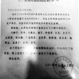 北京市药品检验所向平谷警方出具的关于此案熏蒸药包检验结果说明中显示,2014年9月18日该所接到平谷治安支队送检的熏蒸药包样品,鉴别药包中的中药饮片品种。