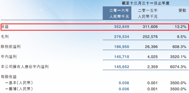 先健科技2016年度业绩报告显示,该公司收益同比增长13.2%至3.528亿元人民币(单位下同);股东应占溢利同比大增近60倍至1.457亿;每股收益0.036元。