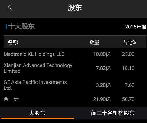 按换股数计算,在第一批可转股票据行使后,美敦力获得先健科技25%的股权,第二批行使后,美敦力将获得51%的控股权。据Wind最新数据,目前美敦力已成为了该公司第一大股东。
