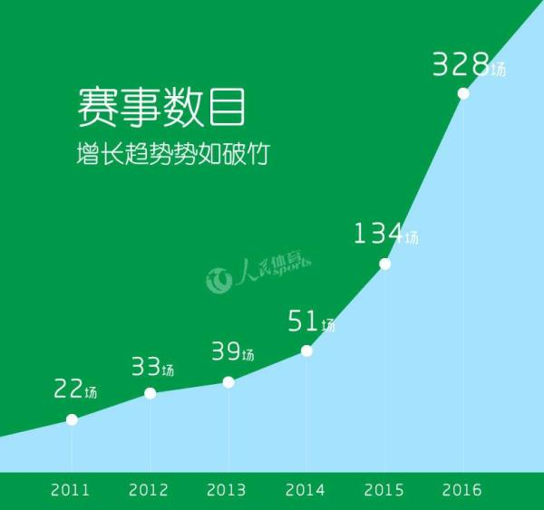 在2016年,中国的马拉松赛事延续了“井喷”的态势。据人民网统计,去年全国的马拉松赛事已达到328场,比去年增长了1.45倍,比2011年增长了14倍之多。