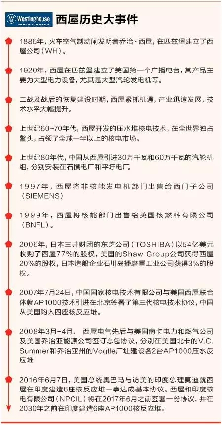 作为曾经的“核电鼻祖”,翻开其130年的历史,仍可看到战绩显赫。在上世纪60~70年代,西屋开发的压水堆核电技术,在全世界独占鳌头,占领了世界一半以上的核电市场。80年代以前,西方主要核电国家如德国、法国、日本等所使用的民用核能技术,几乎都来自这家公司。这是西屋最辉煌的时代。