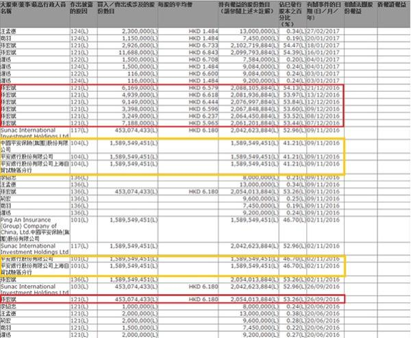 澎湃新闻(www.thepaper.cn)在港交所披露的股东名单中发现,在融创中国目前的股东名单中,孙宏斌的持股比例为54.47%。而中国平安保险集团、平安银行股份有限公司以及平安银行上海自贸试验区分行的名字赫然出现在股东名单中,持股比例为41.21%,最近一次的更新时间为2016年11月9日。