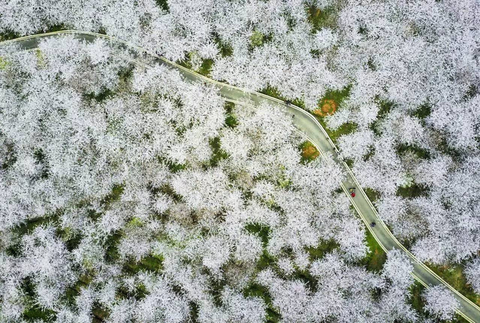 3月27日,贵州省安顺市,贵州贵安新区(原平坝农场)红枫湖畔上,由50余万株樱花树组成的万亩樱花园内的樱花竞相盛开,空中俯瞰,花海如云似雪,蔚为壮观。