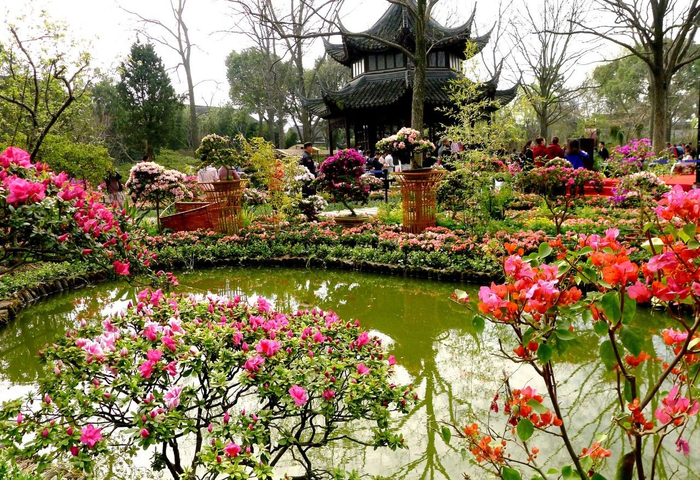 3月28日,江苏苏州,苏州拙政园的“天泉亭”景点杜鹃花缤纷靓丽景致。