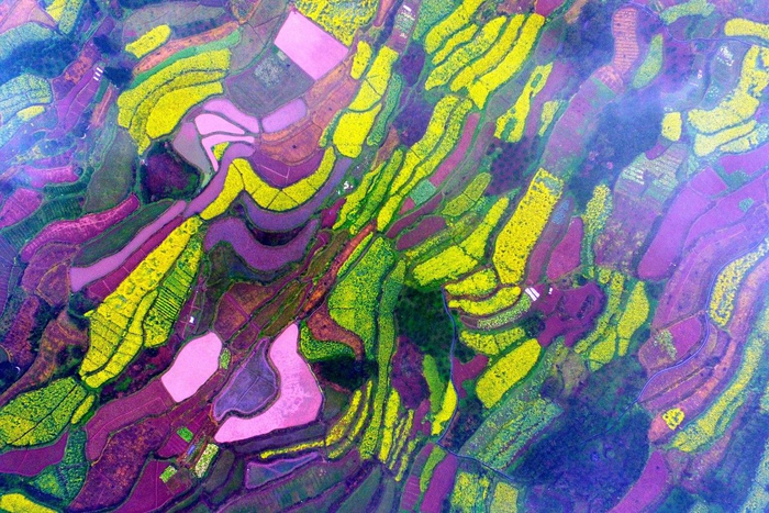 3月,湖南湘西,泸溪县大陂流,俯瞰雨雾中的梯田,花海迎春怒放,线条交错,色彩斑斓,宛如大地“调色盘”。