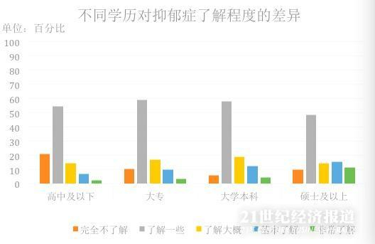 调查显示,不管学历高低,非常了解抑郁症的个体的比例非常低,大约50%的个体只了解一些。然而高学历的人群中非常了解抑郁症的个体比例(10%多)要比低学历的人群的高(3%左右)。这一调查结果显示说明中国民众对抑郁症的了解很不足。即使是高学历的人对抑郁症的了解也很有限。