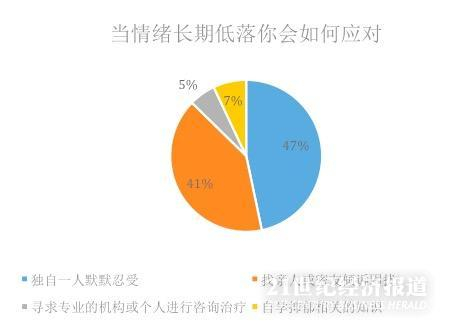 当个体情绪长期低落可能是抑郁的个人,一般都采用什么方式来应对。调查结果显示,只有5%的人会寻求专业机构或者个人的帮助。大部分个人都是采取独立默默忍受或者找亲人和朋友倾诉。这表明大部分人还不能采用正确的方式来应对抑郁。