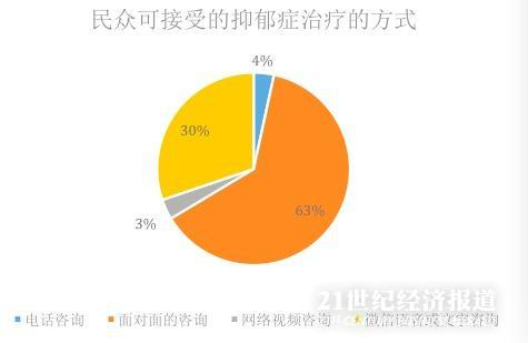 无关哪个年龄段,何种学历和收入水平,相比网络咨询或者电话咨询方式,60%多的民众更倾向面对面的治疗方式,有30%的民众认为微信语音或者文字咨询更可以接受。这一调查结果表明大多人认为抑郁症这种心理疾病更适合于通过与专家面对面交流的方式来治疗。