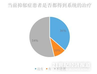 我们调查显示,抑郁症患者得到系统治疗的只占总人数的10%左右。大部分的抑郁症患者都没有得到系统的治疗。这表明国内对抑郁症的治疗现状并不理想。分析可能的原因发现,70%-80%的人报告自己不清楚有没有(或者没有)可以进行心理治疗的机构和个人。