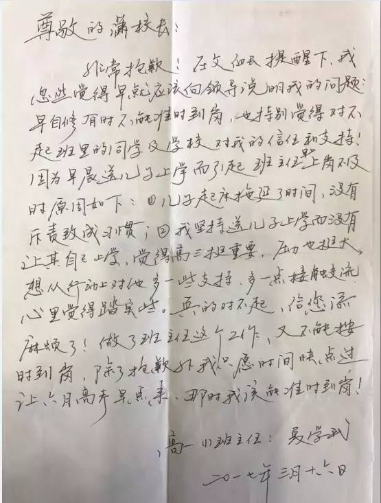 他从来没有写过请假条,这是他第一次写,写这张请假条时,他内心是充满了愧疚感。“儿子今年读高三,是人生中最关键的转折期,我想每天送他上学。”夏老师对记者说,他怕错过了高三这一年,以后就再也没有机会送儿子上学了。