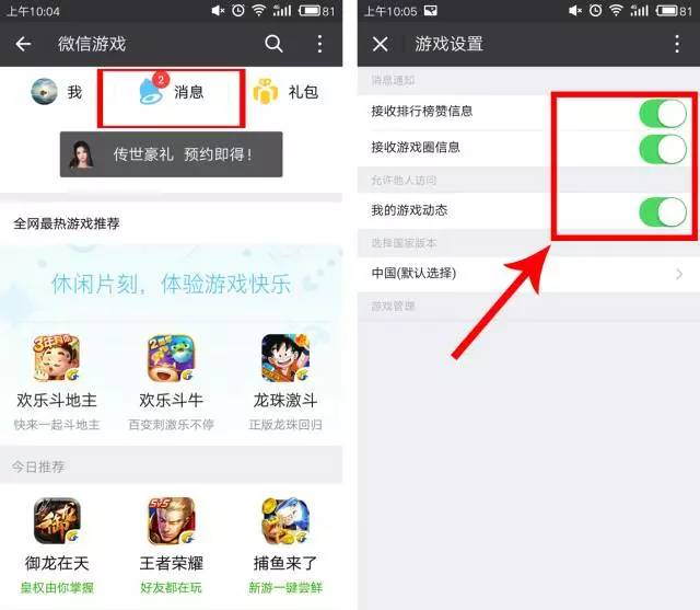 同样是进入微信后,依次点击【发现】—【游戏】—点击右上角的【设置】图标—【游戏管理】—然后分别将【接收排行榜赞消息】以及【接收游戏圈消息】关闭即可。