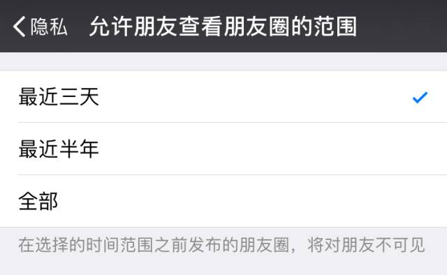 允许朋友查看朋友圈的范围,可选择“最近三天”“最近半年”和“全部”(若不进行更改,则默认为全部)。