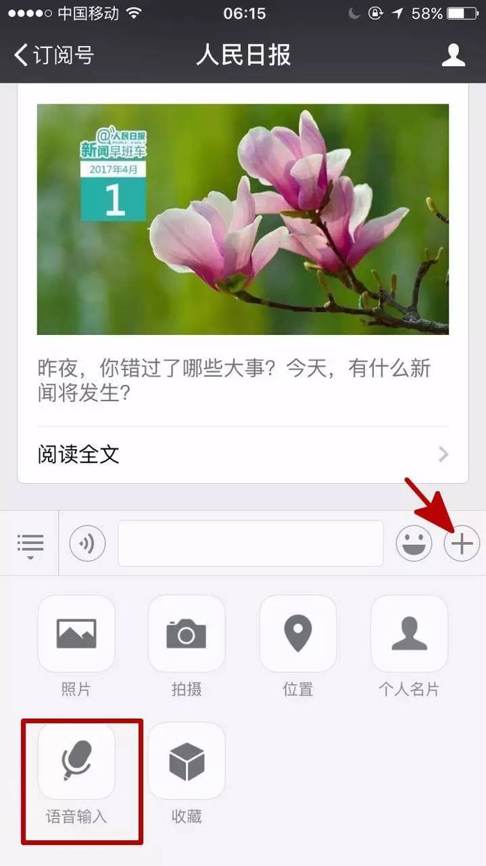 打开聊天页面,点击右边的【+】→选择【语音输入】。