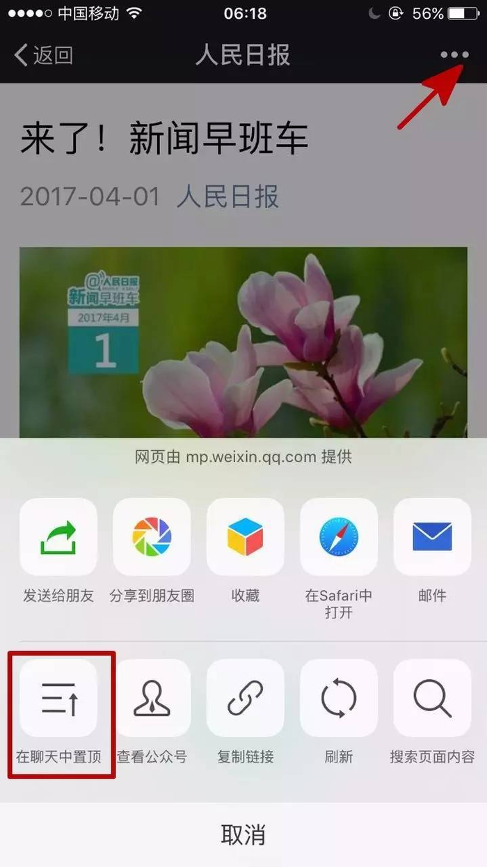 打开文章,点击右上角【···】→选择【在聊天中置顶】。