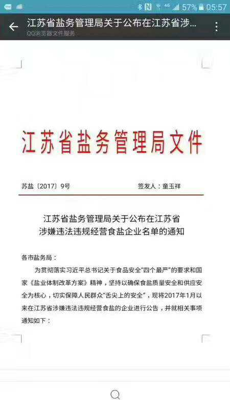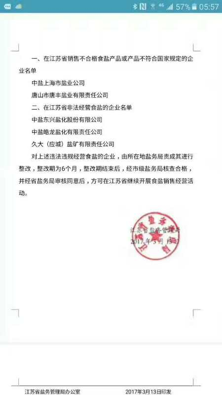 3月13日,一份文号为苏盐【2017】9号的红头盖章文件(以下称“9号文件”)由江苏省盐务管理局印发,其中列明了“中盐东兴在江苏省非法经营食盐”,与中盐东兴同样“违法/违规经营食盐”的企业还有四家。