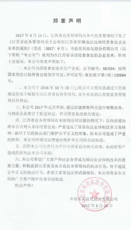 3月20日,中盐东兴官网发布声明,再次重申公司已取得食盐批发许可证,从2017年开始,通过自建销售网点销售食盐,并与物流企业签订了配送协议;对于江苏省盐务局内部通知将其定为“非法经营”企业的做法,将通过法律程序维护权益。