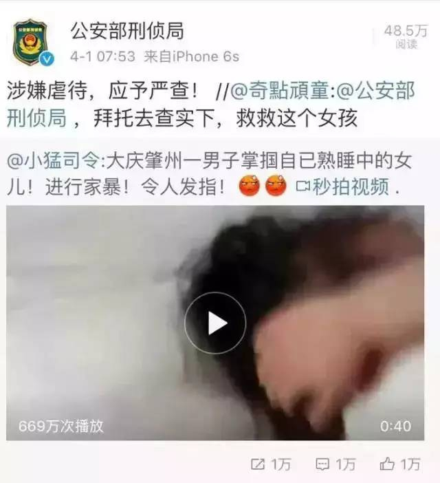 4月1日早晨,公安部刑侦局官方微博就此视频表示:“涉嫌虐待,应予严查。”