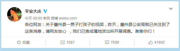 随后,黑龙江省大庆公安局通过官方微博发布消息:“关于肇州县一男子打孩子的视频,昨天,肇州县公安局就已关注到了这条消息,请网友放心,我们已责成属地派出所开展调查。谢谢你们!”
