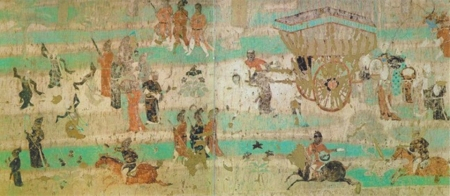 当然,敦煌人的清明节也别有一番滋味。借助敦煌壁画,我们穿越回那个春风拂面、相约踏青的清明节。在成都博物馆的敦煌艺术大展上,有几幅反映唐朝人外出踏青的壁画,场面高调奢华,阵仗之吓人。例如盛唐130窟的《都督夫人礼佛图》,是唐代的贵妇——太原王氏带着女儿、侍女一行12人外出礼佛。雍容华贵、妆容精致的女子背后有垂柳萱草,蜂蝶环绕,结合她们的襦裙服饰,可以推测时间大概在阳春三月。如果你对这个贵妇出游的场景兴趣寥寥的话,不妨参观晚唐156窟的《宋国夫人出行图》,河内郡张议潮的夫人宋氏骑着高头大马春游,前有百戏杂耍,乐队伴奏,中有保镖开道,仪仗威武,后面还有大批的侍从手持金银细软,还牵着骆驼运输粮食酒肉,这么奢华盛大的场面,是不是比迪拜王子开着豪车遛老虎更拉风?