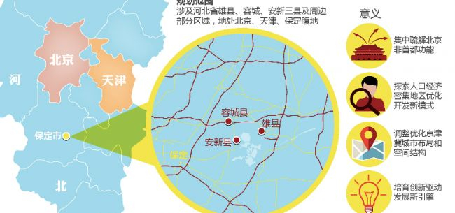 日前,中共中央、国务院印发通知,决定设立河北雄安新区。根据目前公布的规划,雄安新区的规划范围涉及河北省雄县、容城、安新3县及周边部分区域,起步区面积约100平方公里。这个经济新区的首要任务就是集中疏解北京非首都功能,探索人口经济密集地区优化开发新模式,调整优化京津冀城市布局和空间结构,培育创新发展驱动新引擎。