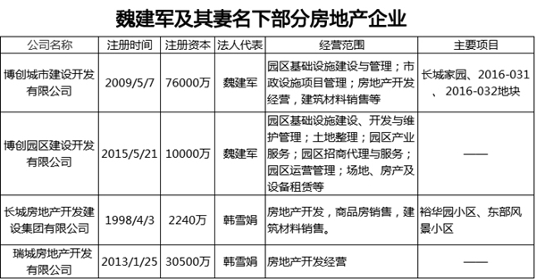 博创城建只是魏建军房地产板块中的一部分,据公开资料不完全统计,魏建军及其妻韩雪娟名下尚有长城开发建设集团有限公司、保定瑞城房地产开发有限公司、保定博创园区建设开发有限公司等多家房地产开发公司,总注册资本高达11.87亿元。除此之外,魏、韩夫妇名下还有多家涉及房地产领域的投资公司,以及房地产相关业务的建材、钢构、园林公司。