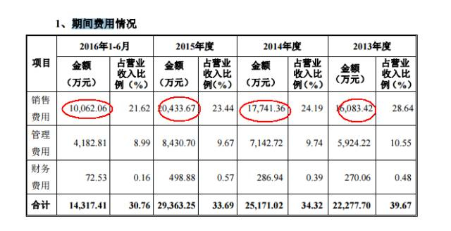 野马财经(微信公号:ymcj8686)查阅金牌厨柜招股书发现,金牌厨柜在报告期内(2013年、2014年、2015年及2016年1-6月)的期间费用始终居高不下,招股书显示,报告期内的期间费用分别为22277.70万元、25171.02万元、29363.25万元和14317.41万元,占当期营收的比重分别为39.67%、34.32%、33.69%和30.76%。其中又以广告业务宣传费最为显眼。