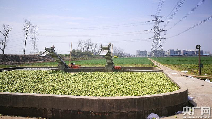 与榨菜园里气氛同样紧张的是榨菜加工企业的腌制基地。在余姚国泰公司一个榨菜收购点,菜农们用三轮车把刚收割的榨菜一车一车的运过来,上秤,倒入清洗池,再捞出来倒入腌制池。不少企业的腌制池容量已经严重不足,影响了收购速度。