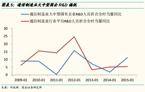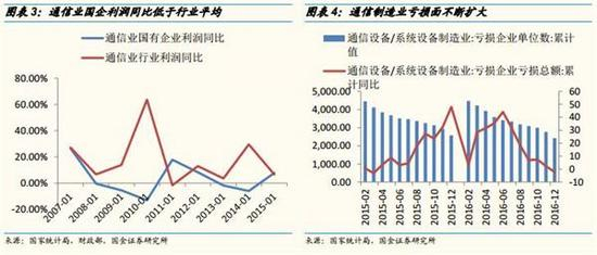 通信行业国企亏损面持续,研发后继乏力。通信行业国企利润总额增速一直低于行业平均,大幅落后于私营、外商及港澳台商企业。不过在15年国企盈利能力略微上升,我们认为这可能受益于新一批国改试点的推行。刨除三大电信运营商外,通信服务和通信设备子行业竞争强劲,国企相较于私企受到更多政策倾斜,投融资相对容易,理应在研发能力上更胜一筹。然而大中国企R&D较行业均值低,研发能力落后使得国企在通信这个板块处于弱势,唯有通过混改引入活跃的民间资本,才能有效盘活国企僵硬体质。