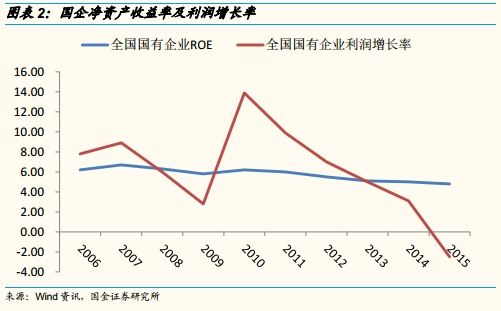 国企盈利能力处低位。国企受到政府的大力扶持,缺乏自主创新激励,近年来国企净资产收益率不断下降,15年已降至4.8%,利润增长率自10年也处于下行态势,15年更是出现负增长。业绩的不断下滑使得国有资本不断流失,在“国有资本保值增值”的大势下改革势必要加速推进。