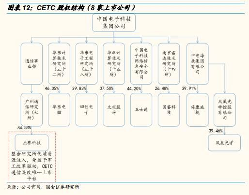 中电科系(杰赛科技、国睿科技、太极股份、海康威视等):叠加军工混改,预期主要改革方向为资产证券化和军工研究所合并重组。CETC旗下研究所遍布全国各地,数量很多,且旗下上市公司大股东大部分都是研究所,二级研究所资源整合在短期可行度较高;集团的证券化率约20%,提高资产证券化率势在必行。投资标的看好注入通信、导航板块优质资产的杰赛科技.