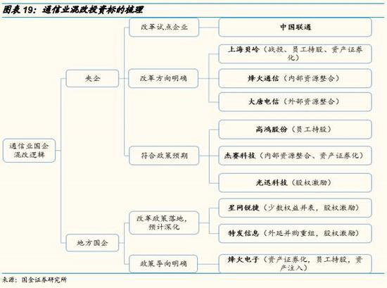 星网锐捷(福建):混改新模式,上市公司全资控股核心子公司;特发信息(深圳):地方国资改革重点推进平台,主要方式为深化股权激励+外延并购重组;烽火电子(陕西):国资委政策导向明确,主要方式为资产证券化+员工持股计划+资产注入。