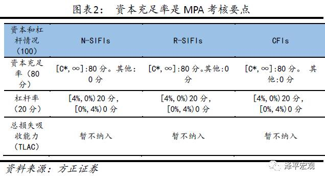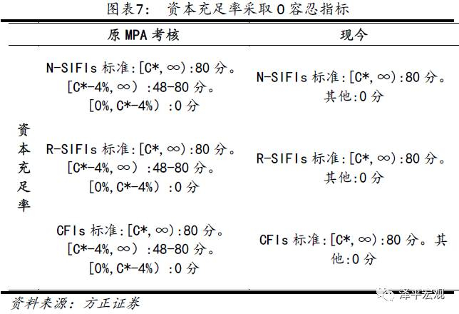 资本充足率被认为是MPA考核中最关键的指标。从国际经验来看,巴塞尔协议I、II、III均对资本充足率进行重点要求,各国金融监管当局使用这一指标来监测银行抵御风险的能力,目的在于抑制风险资产的过度膨胀,保护存款人和其他债权人的利益、保证银行等金融机构正常运营和发展。年后MPA考核中,资本充足率取消容忍度指标,对于未达标的银行将得0分。MPA考核此前自2016年推出以来,不可能一步到位,给予被考核机构一定的能动空间,特别是规模较小、风险较高的地方及区域性商业银行,在MPA考核推出一段时间后,根据现实经济情况调整评价考核体系,明确考核的重点和限制,进一步加强对被监管机构的有效监管,谨防银行等为通过MPA考核进行短期调整,旨在长期引导、规范银行的市场行为。
