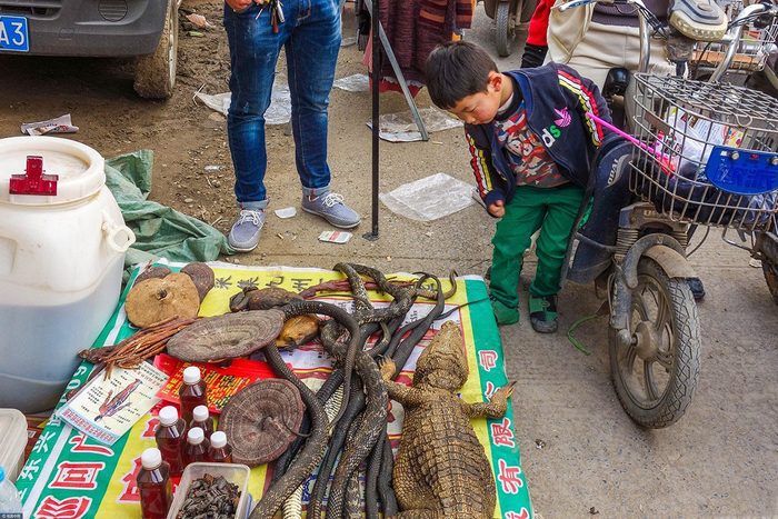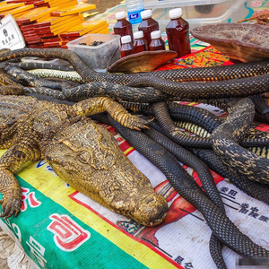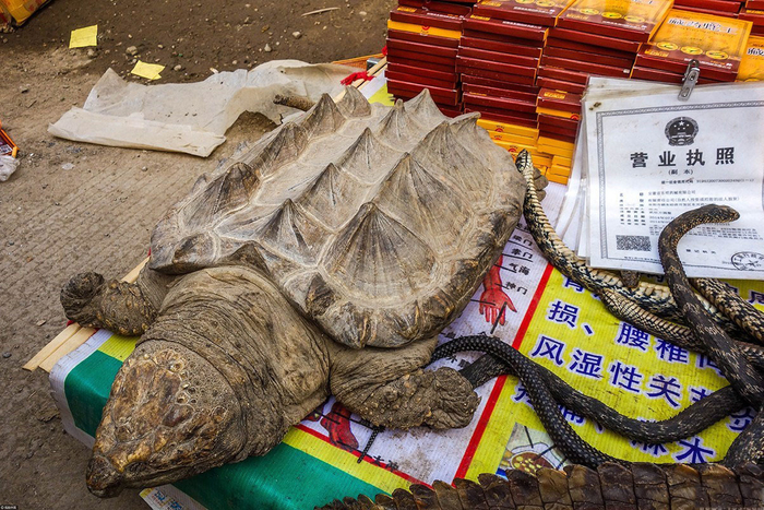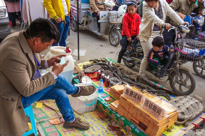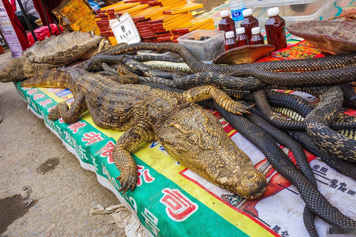 2017年4月6日,江苏省徐州市,在铜山县西沿集市上,现场看到,卖龟的是一名中年男子,地摊上摆放的鳄鱼有一米多长,躯体已风干成标本,紧靠鳄鱼旁边的大乌龟也有二十余斤重,坚硬的壳上整齐地排列着很多山峰状的凸起物,也早已死亡成动物标本,几条黑斑蛇标本依次排放着。