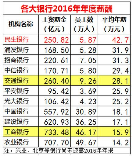 统计发现,银行业中,目前薪资最高的是民生银行,2016年平均年薪为42.7万元,可是这一薪资水平距离华为竟然还有50%的差距!