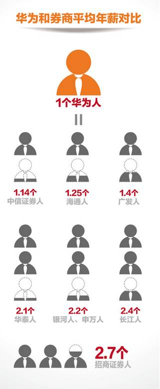 券商中,中信证券和海通证券的平均薪资领先,分别为55.4万和50.5万元,1个华为人的年薪等于1.14个中信证券人和1.25个海通证券人的年薪。