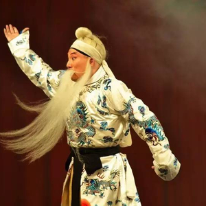 耍髯口是戏曲表演中生、净、末、丑极富特色的肢体及面部动作,以呈示人物当下的特定情绪。古人言“在颐曰须,在颊曰髯”,髯口又称口面、髭口,是生、净、末、丑必戴的假须——大都用马尾、牦牛毛、犀牛毛或人发制成,一般有黑、灰、白三种。后来戏曲丰富了,髯口也多起来,比如戴红髯、紫髯、蓝髯、黑红髯,借以凸显其形貌怪异或性格暴烈,至于戴红、黄、蓝、白、黑五色髯的,意在表示强烈的贬斥倾向,如粤剧中扮金兀术和方腊的,便是五色髯。
